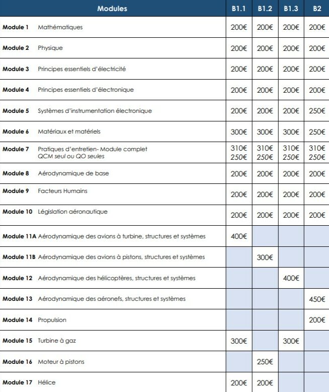 Les examens sont constitués de QCM (Questionnaires à Choix Multiples) et/ou de questions ouvertes, conformément aux exigences de la Part 66.